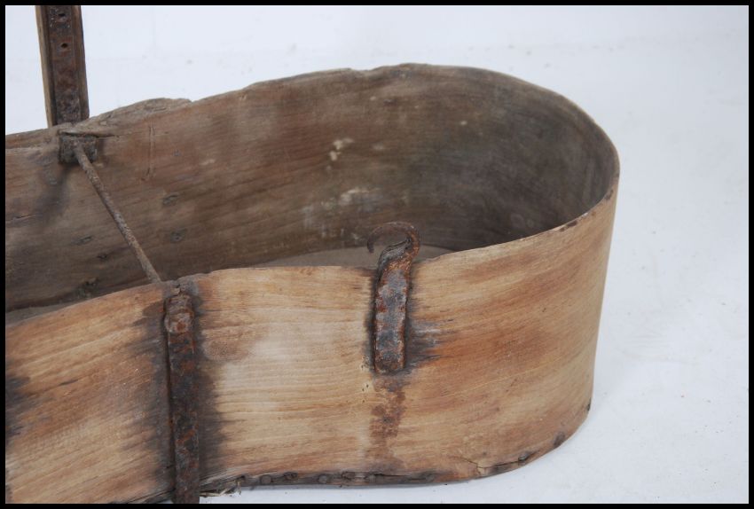An unusual 19th century agricultural mule trug - horse's side carrier. The kidney shaped trug with brackets to one side believed to be for an ass / mule
