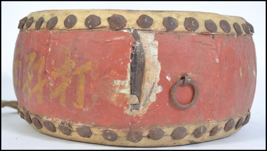 A 20th century Chinese style temple drum having animal hide drum skins painted with flora and dragons. With applied label for H Hinks Martin Leicester Street London WC2. Measures 32cms wide.