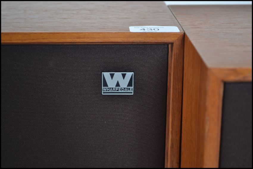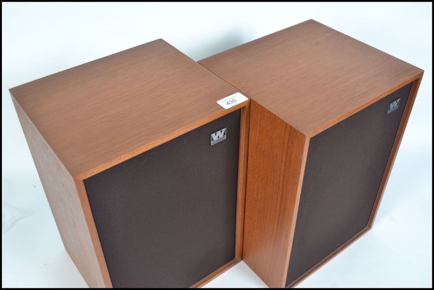 A pair of retro Whafdale Denton 2XP teak cased bookshelf speakers with applied Wharfdale labels to the rear.