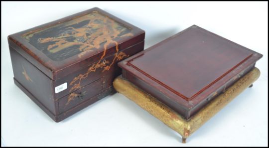 A vintage early 20th century Japanese chinoserie laquered jewellery box with hinged cover, lift out interior sections, a run of four drawers. Decorated with Mount Fuji, Cranes and village scenes. The lower drawers with handles formed as butterflies. Raised on shaped feet. Measures 41cm wide x 22cm high.