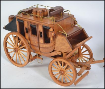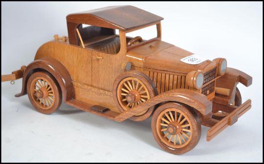 An impressive collection of 3 hand carved and crafted wooden vehicles to include a traditional horse drawn carriage being fully articulated together with a vintage model car, again all parts working / moving and also another vintage car. Beautifully carved by M. Williams of Newport being part of an extensive collection of wooden crafts, figures and models in this sale. Measures 36cms long.