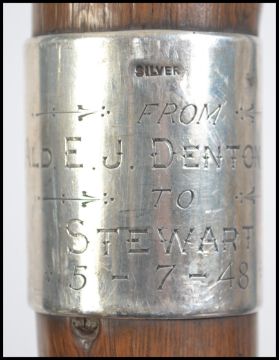 A early 20th century silver hallmarked collared promenade cane with horn handle, brass feral, dating to 1909, together with a large black thorn walking stick with a silver collar and notation ' From ALD E.J. Dentom J.P to Stewart 5-7-48'.