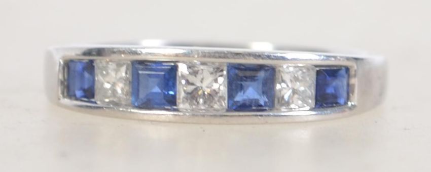14ct white gold diamond & sapphire ladies ring being channel set. Total weight 3.1g / Size N