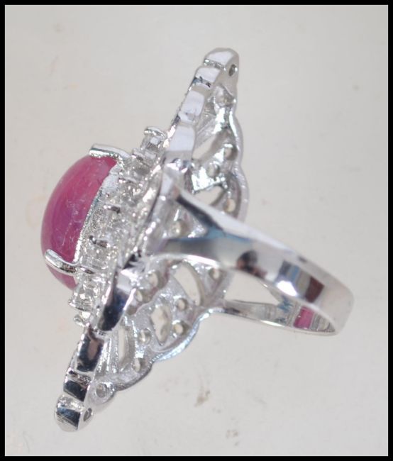 A ladies silver and cz cocktail dress ring adorned with a large ruby garnet cabochon stone in an open mount. Size N.5 / Weight 9.8g