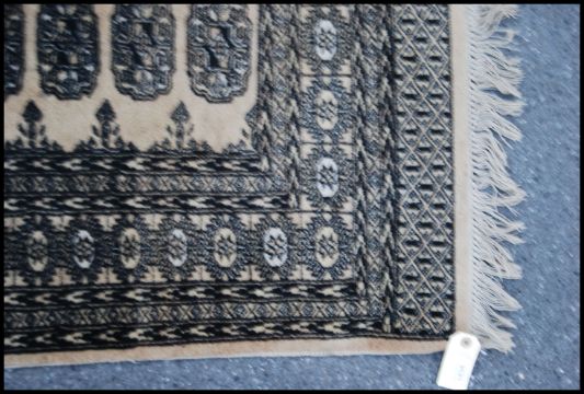 An early 20th century Bokhara rug having 3 rows of 15 medallions to the centre with geometric borders. Measures 185cms x 130cms wide.