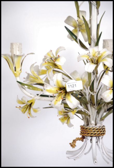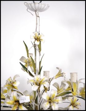 A stunning vintage metal work Italian toleware chandelier / light fixture being very ornate and adorned with painted flowers and leaves please see images. Measures: 60cms high x 50cms diameter