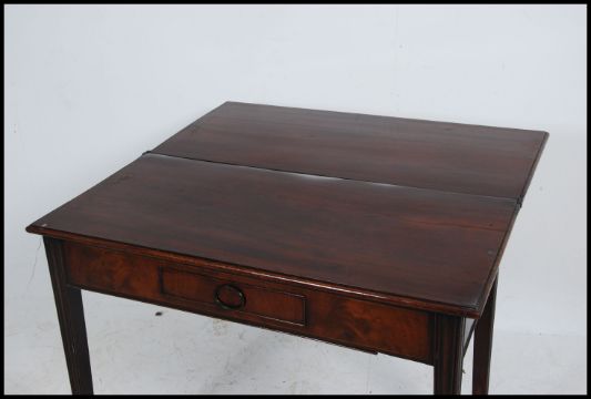 A Georgian 19th century mahogany tea / games table being raised on squared legs with frieze drawer and hinged fold over tea table top. Measures 75cms high x 91cms wide x 43cms deep.