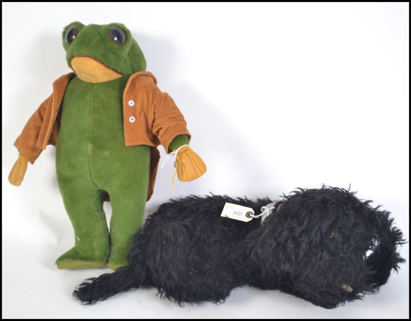 A Wind In The Willows Mr Toad Of Toad Hall stuffed (mostly straw) vintage plush toy . This is complete with corduroy tailcoat. The second item is a vintage black Scottie dog with a padlock to neck with a leather collar. It has an unusual zipped jewellery compartment and another zipped compartment thought to house a hot water bottle. Frog measures 42cms high.