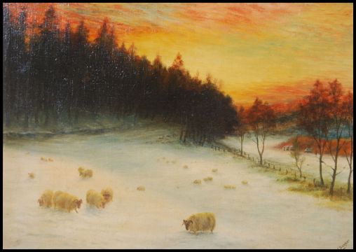 N.V. Barker. An oil on board painting of a snow swept farming scene with sheep and rams grazing. Signed to the corner set within an ebonised frame. Measures: 25cms high x 35cms deep.