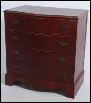 A Georgian revival serpentine fronted / bow fronted mahogany bachelors chest raised on bracket feet with a series of short and deep drawers having brass handles. Measures: 83cms high x 78cms wide x 49cms deep.