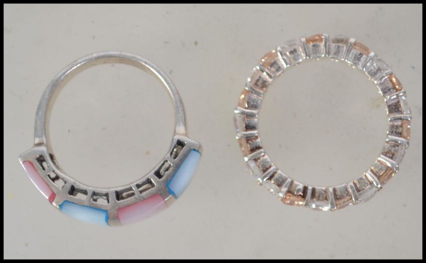 Two contemporary silver ladies dress rings to include a cz round cut adorned full eternity ring and another being enamel set. Both Size P / Combined weight 9.9g