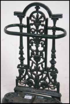 A 20th century Coalbrookdale stick / umbrella stand in cast iron with painted white finish. The tray to base with rococo upright and double section hoop stick stand.