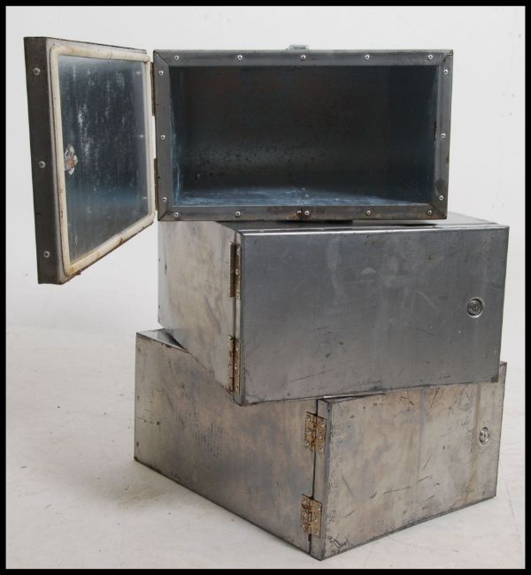 A pair of Industrial 20th century metal locker boxes. The polished steel bodies with lined polished interiors each with locker doors and handles. H23 x W40cm x D48