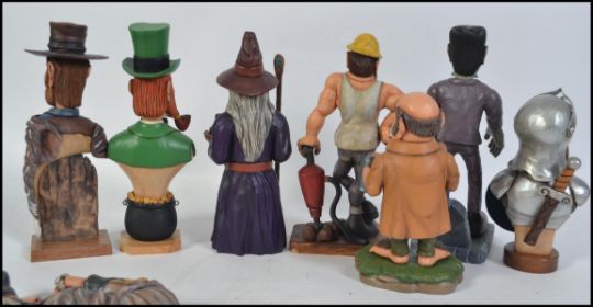 A collection of 9 hand carved and painted wooden figurines to include a Frankenstein, Road Worker, Knight, Lord of the Rings, Leprechaun etc. Each Beautifully carved and painted by M. Williams of Newport being part of an extensive collection of wooden crafts, figures and models in this sale