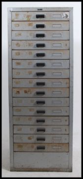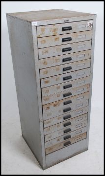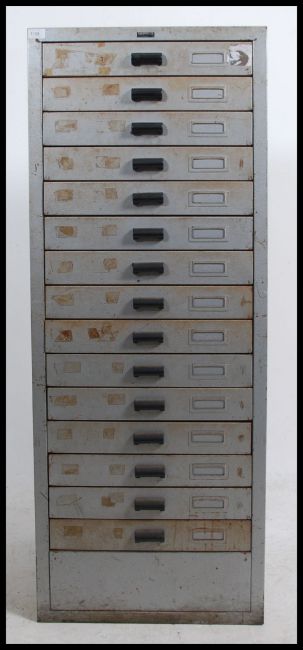 A large 14 drawer metal industrial 20th century pedestal chest cabinet by Amersham of Bristol Ltd. The large cabinet with grey enamel metal finish. Measures: 139cms high x 53cms wide x 57cms deep.