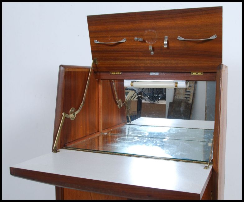 A 1970's retro Danish influence cocktail cabinet / drinks bar having fall front appointed top with cupboard beneath being raised on an inset plinth base. Measures: 104cms high x 61cms wide x 38cms deep.
