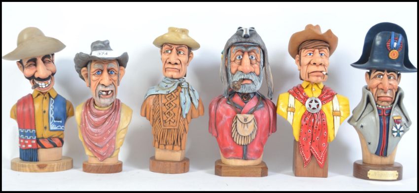A collection of 6 impressive hand carved wooden American Frontier Men, Mexican Bandito, Napoleon etc all on plinth bases. Each Beautifully carved and painted by M. Williams of Newport being part of an extensive collection of wooden crafts, figures and models in this sale. Measures 23cms high.