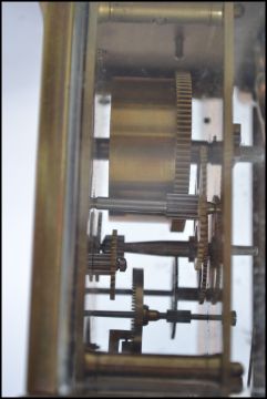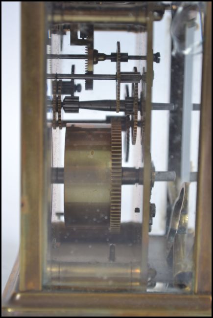 An early 20th century brass carriage clock with enamel dial, open window escapement to the top with shaped handle. Measures 14cms high.