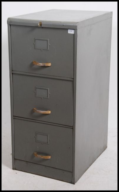 A vintage mid 20th century three drawer grey painted filing cabinet with brass style ribbed handles. With working key.