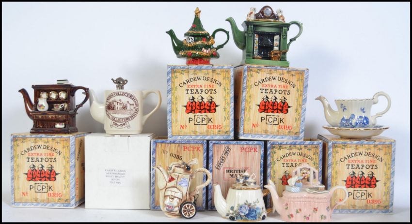 A collection of eight boxed collectors novelty teapots by Paul Cardew. All of different designs within original boxes.