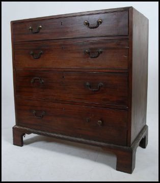 A Georgian 19th century mahogany chest of drawers. The chest being raised on bracket supports with a straight 4 configuration of drawers having brass swan neck handles. Measures 97cms high x 91cms wide x 46cms deep.