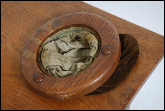 A 20th century church lectern with folding kneeler / knee pad along with a collection bag and an ecclesiastical hanging embroidery. Measures: 76cms high x 46cms wide x 42cms deep.