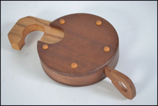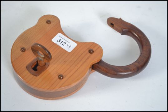 An impressive hand carved collection of 3 large wooden padlocks complete with keys and working. The padlocks each constructed of specimin woods Beautifully carved by M. Williams of Newport being part of an extensive collection of wooden crafts, figures and models in this sale. Measures 19cms long.