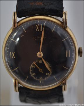 A gentleman's 14ct gold E Gubelin ( Lucerne ) black faced wristwatch. The round silvered dial having raised gold baton and roman numeral quarter markings, faceted hands and signed E Gubelin Lucernce to centre. The movement signed on the rotor Gubelin, Swiss Made, the round case numbered 58332 4/10, inscribed E. Gubelin, Swiss and marked 14K 0.585. All set on a black leather strap.