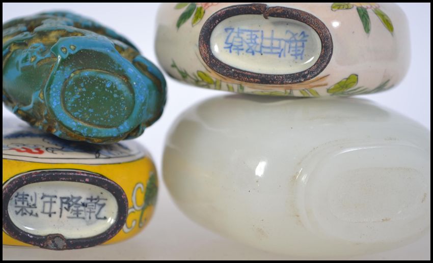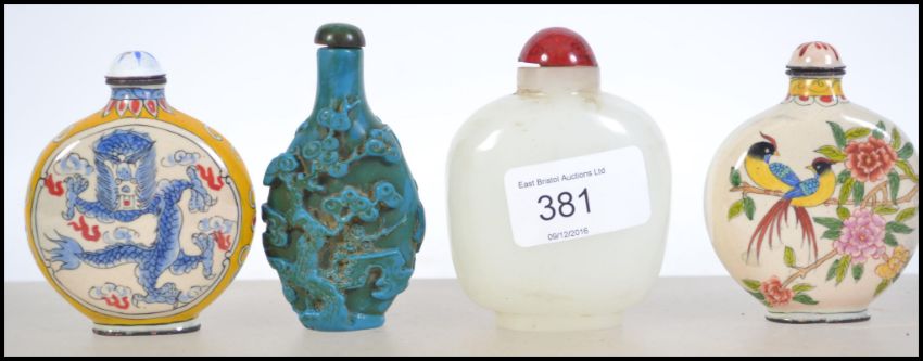 Four 20th century Chinese scent bottles. To include a jade style one, painted glass and enamel examples please see images. Tallest measures 9cms high.