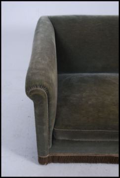 A good Georgian style Chesterfield sofa in the manner Wesley Barrel settee being of upright form with rolled arms and back in an olive green brocade with tassled end detail. Measures: 70cms high x 200cms wide x 82cms deep.