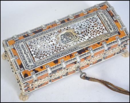 An early 20th century Anglo Indian tortoise-shell and bone jewellery box, decorated centrally with an elephant cartouche, raised on paw feet. Measures 18cms wide.