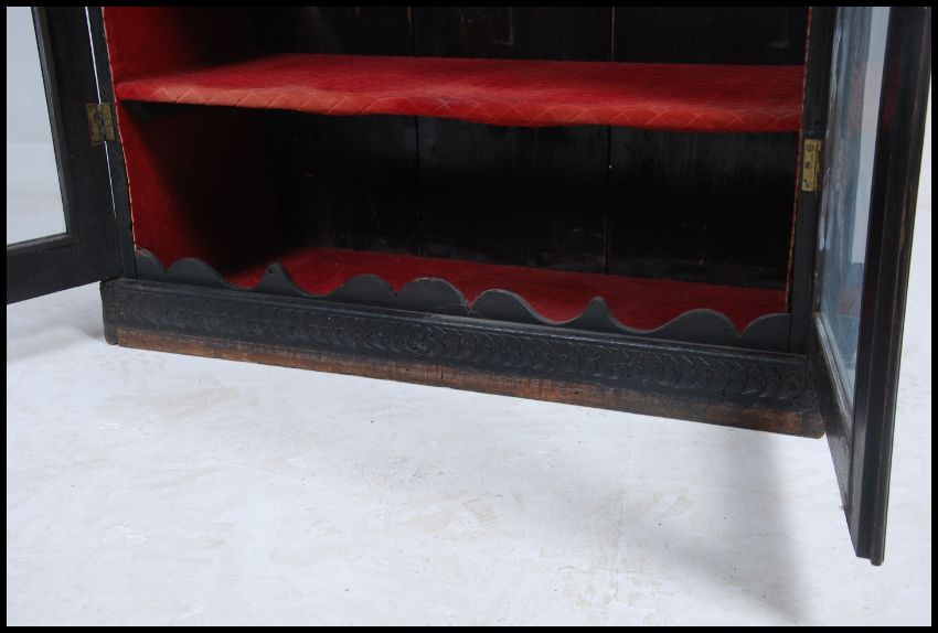 A 19th century anglo-colonial carved library bookcase cabinet. Raised on a plinth base with twin full length glazed doors having a quilted lined interior. Similar bijouterie bookcase cabinet in lot 1457. Measures 132cms high x 93cms wide x 40cms deep.