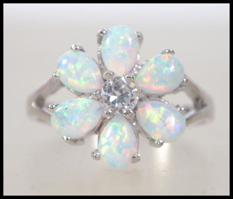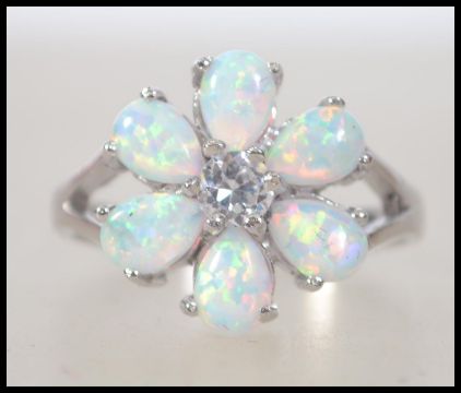 A ladies silver and opal flower head ring having pierced shoulder to the shank. Total weight 3.9g / Size R.5