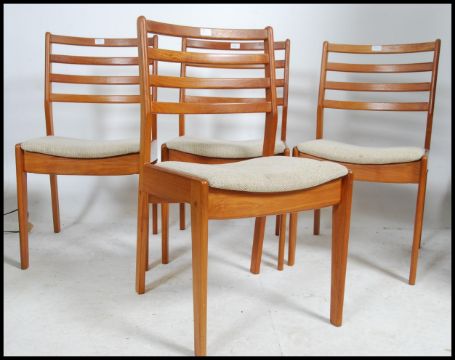 A set of 6 20th century teak wood railed back dining chairs raised on tapered legs with pad seats and bar back rests