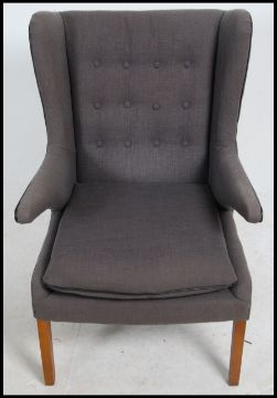 A good 20th century Danish armchair in teak in the manner of Hans Wegner being raised on tapered supports with papa bear style arms. Measures: 99cms high x 66cms wide x 76cms deep.
