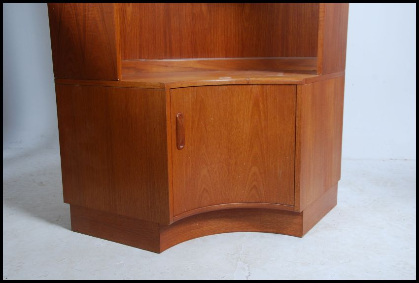 A G-Plan retro 1970's large teak wood curved corner cabinet having base and upright shelf together with a small G-Plan side cabinet
