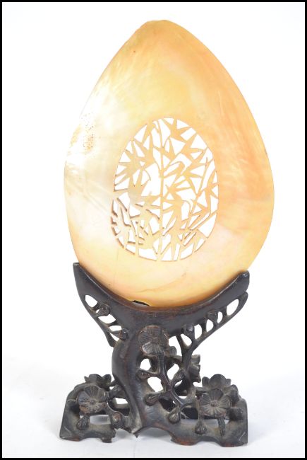 A stunning late 19th century early 20th century Chinese carved mother of pearl shell having fret pierced decoration on prunus blossom decorated wooden socle stands. Measures 29cms high.
