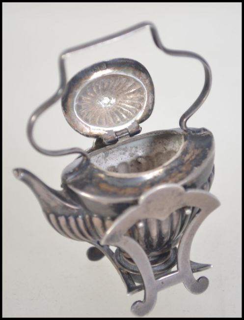 A hallmarked silver miniature spirit kettle and burner / charm. Unusual, with removable base. Hallmarks to side. 14.8g. Measures: 5cm H