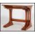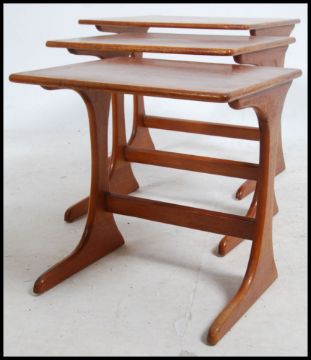 A 1970's G-Plan teak wood nest of tables raised on shaped supports with bow stretchers to each table. Measures: 50cms high x 56cms wide x 44cms deep.
