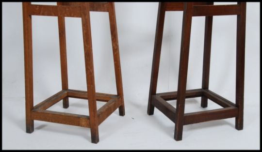 A near pair of mid century Industrial / school coat stands. Dark Oak construction having tapering form with hooks atop. Measures: 173cms high x 36cms wide x 36cms deep.