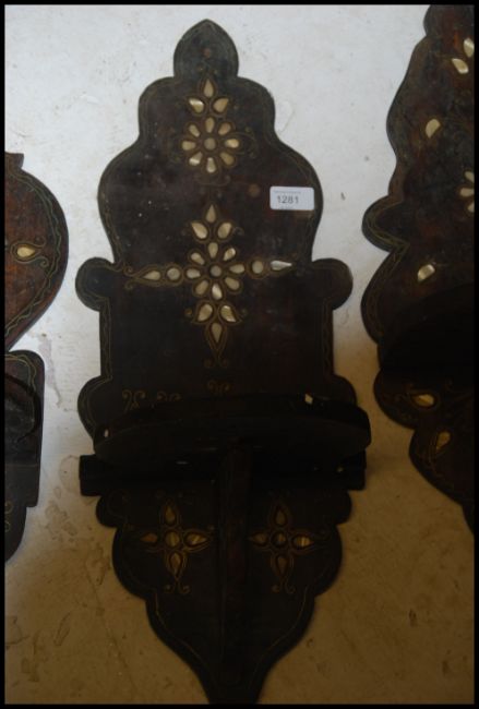 A set of 3 vintage hardwood and mother of pearl anglo-Indian colonial wall brackets for clocks - ideal as shelves.