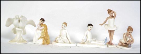 A group of six Bone China figurines to include Little Ballerina HN 3395, Ballet Shoes HN3434, Stage Struck HN3951, Star Performer HN3950, Buddies HN3396 and Always and Forever HN3550. All stamped to base. Tallest 15cms high