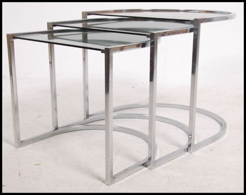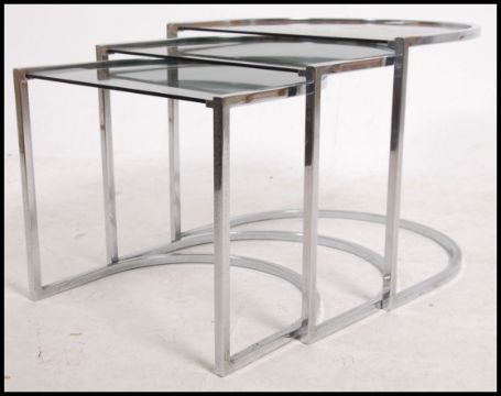 A 1970's retro chrome and smoked glass nest of tables. The tables each with half moon shape and inset smoked glass table tops. Measures: 43cms high x 53cms wide x 41cms deep.