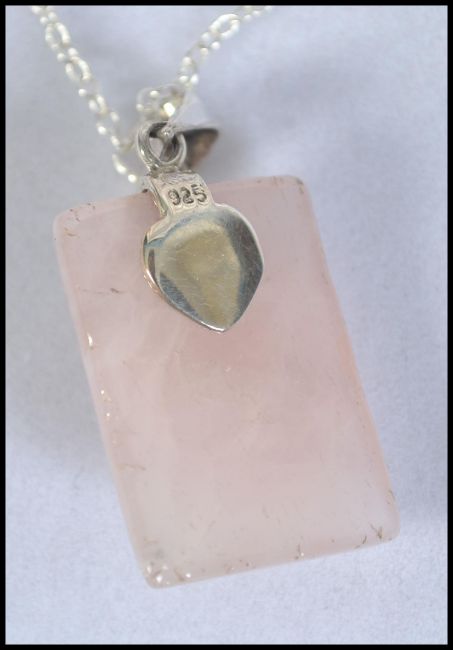 A ladies silver and rose quartz pendant and necklace chain. The rose quartz with rococo silver mount. Total weight 9.6g / Size 44cms. Complete in the presentation case
