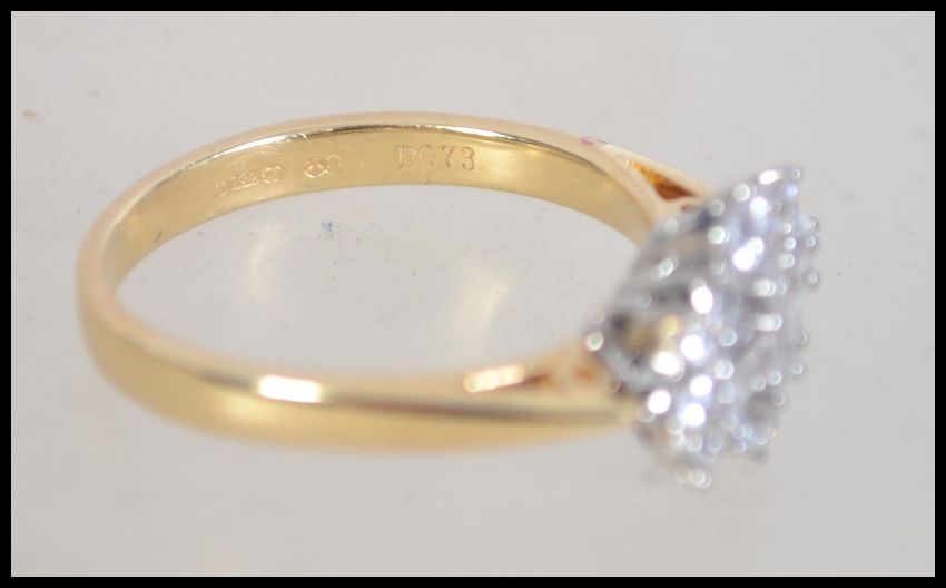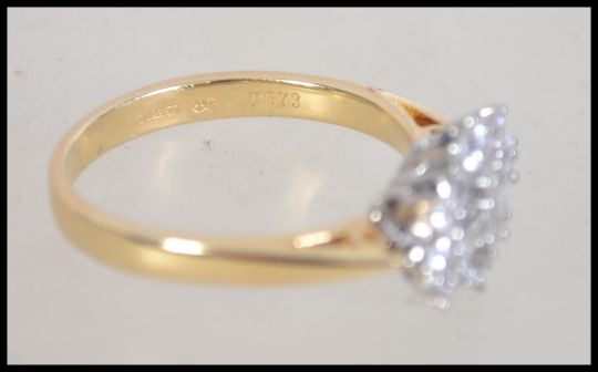 A hallmarked 18ct gold and diamond cluster ring with central baguette diamonds surrounded by round cut diamonds. Total diamonds approx 1ct. Weight 4.5g. Size P.