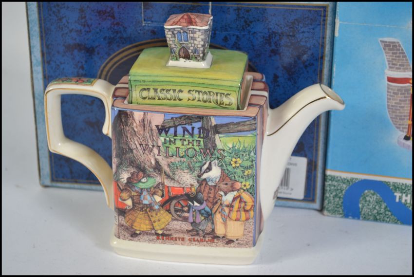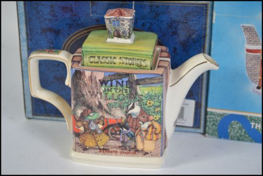 A group of collectable novelty teapots to include East Enders Queen Vic, Only Fools and Horses ' Trotters Van ', Charlie Chaplin, Wind In The Willows '.