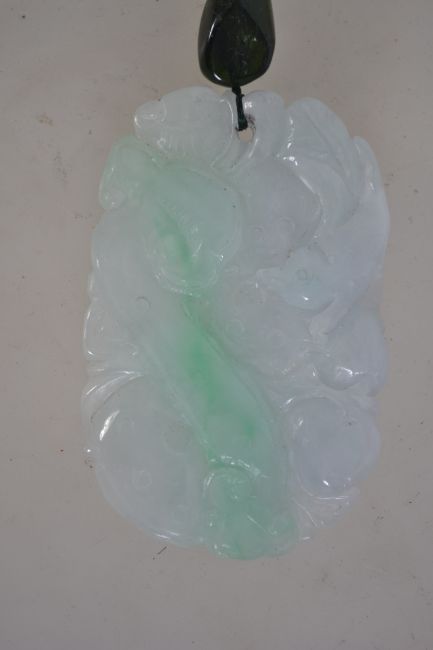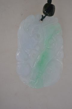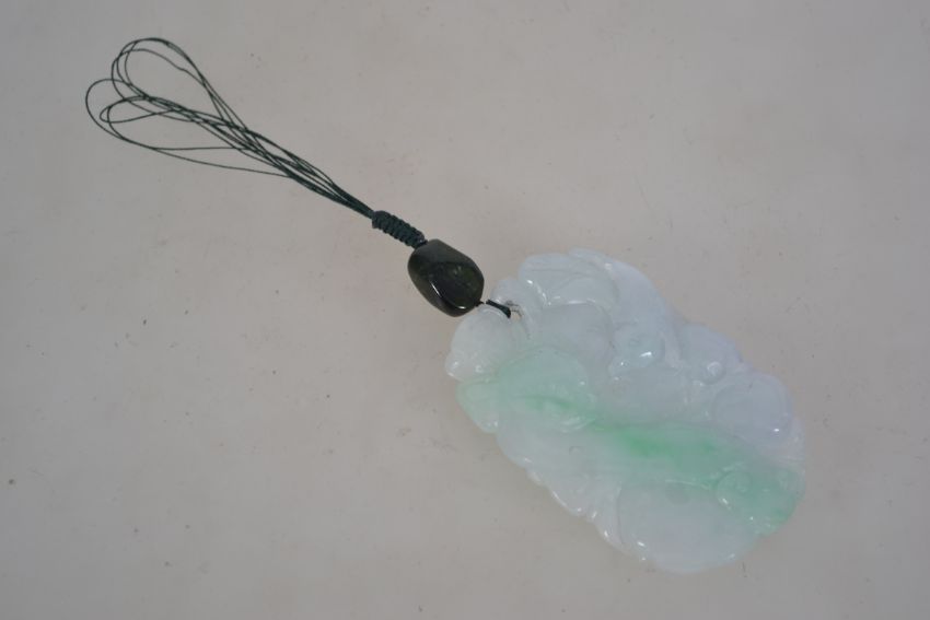A white jade pendant with green stone bead with platted string bale with carved serpent, bird and berries . Total weight 46g.