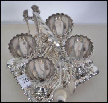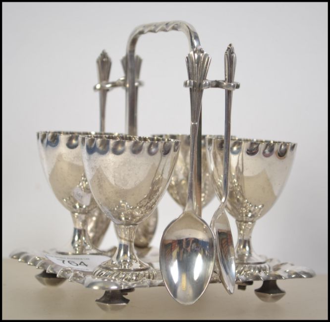 A silver plated four persons breakfast egg service consisting of four egg cups on stand with spoons. 13cms high