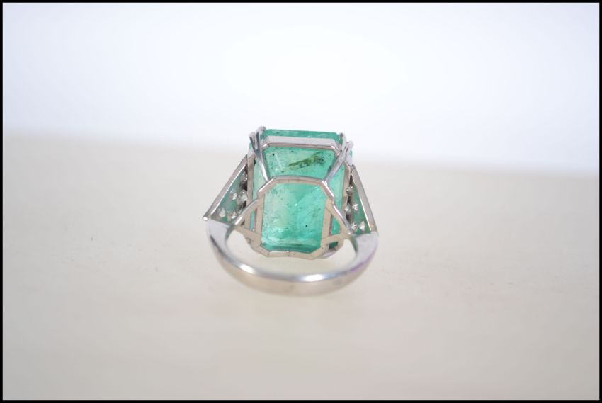 A platinum emerald and diamond ring. A hand commissioned ring in the Art Deco style with central large cushion cut emerald of approx 29.7cts with diamond set shoulders of approx 1.2cts. Size T. Total weight 17.7g