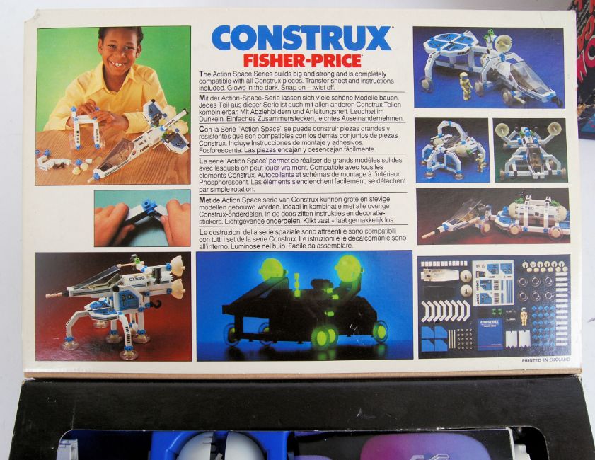 A vintage Fisher Price Construx Action Space 0586 set in its original box. Appears to be complete. Also, a Palitoy Atomic Arcade Pin Ball Machine in its original box with instructions.  Pin Ball Machine 40cm long.